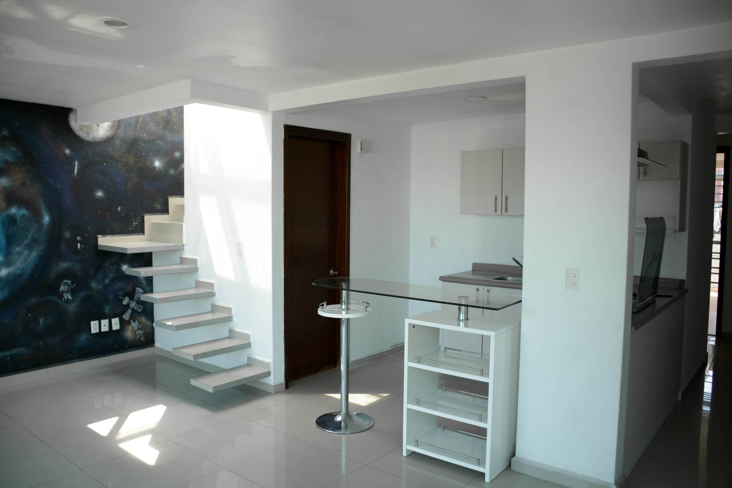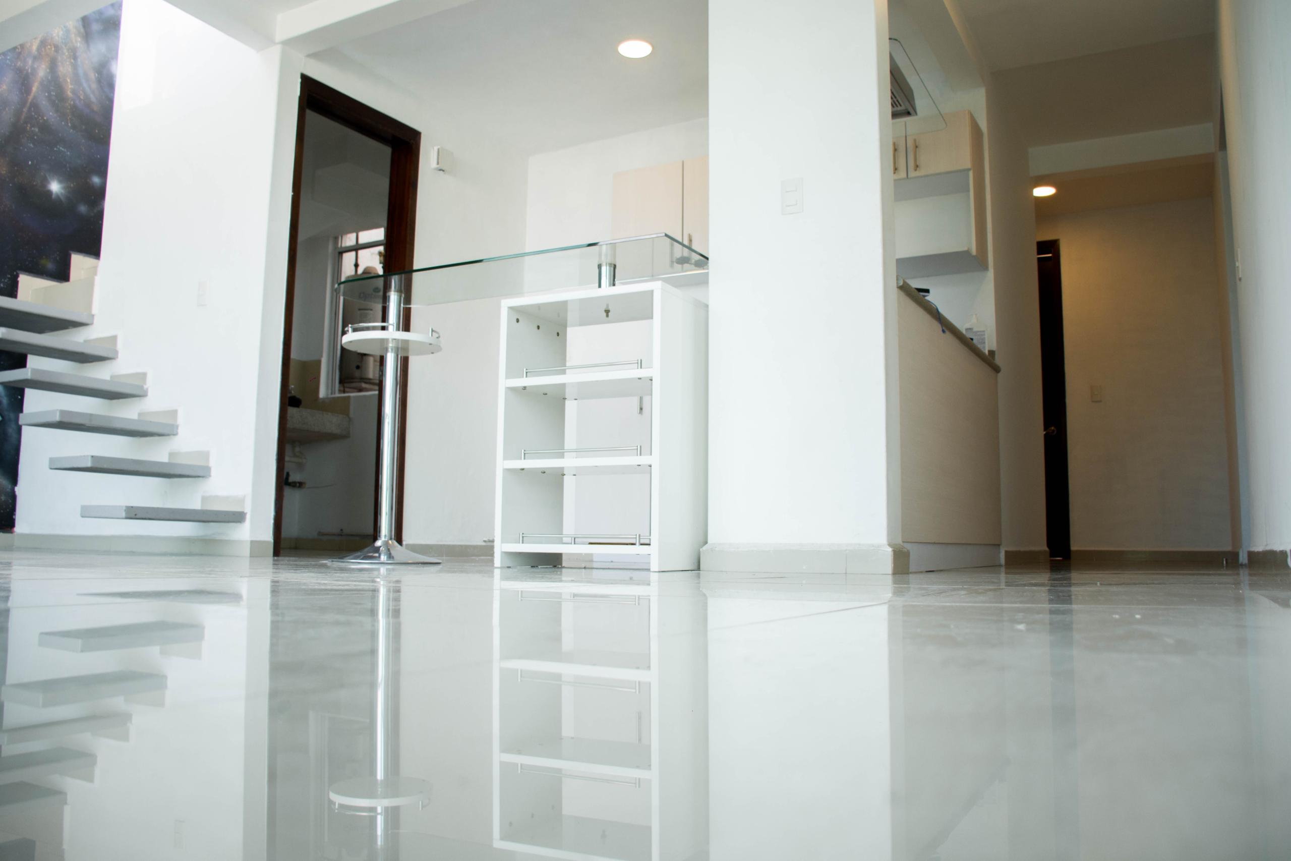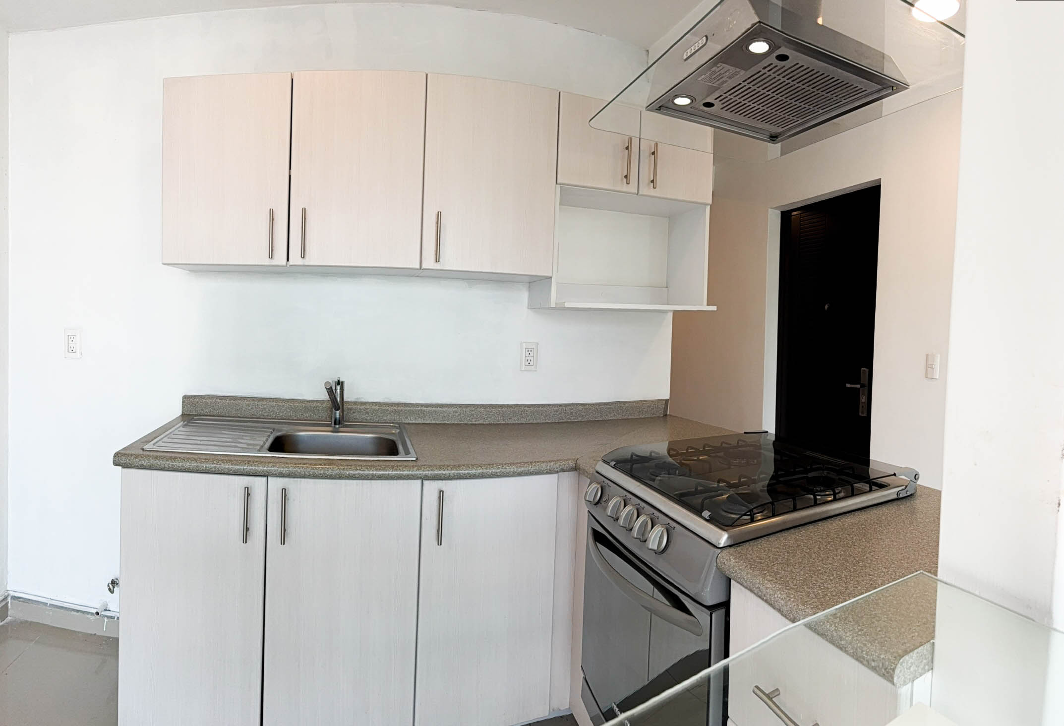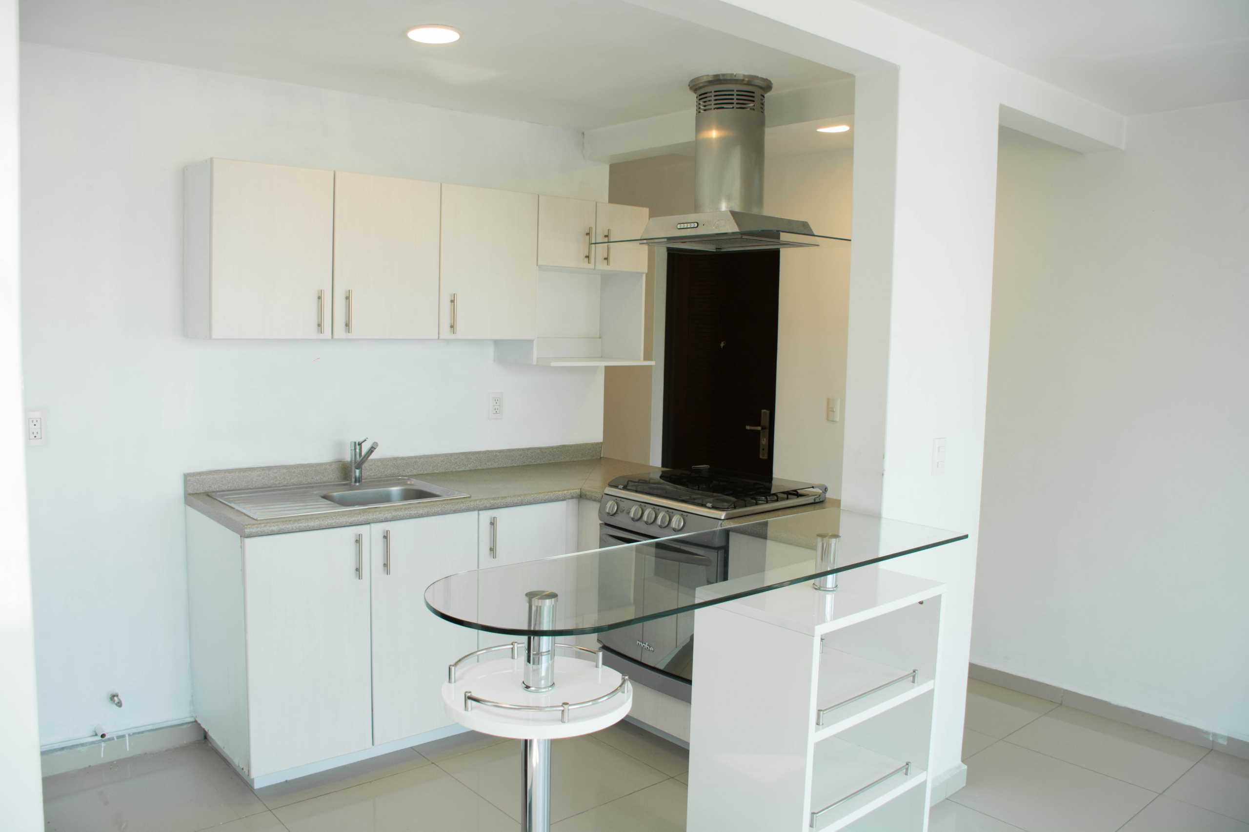 Nivel Residencial: Estancia inundada de luz natural, cocina integral con barra de cristal templado, área de lavado y balcón con ventilación cruzada.