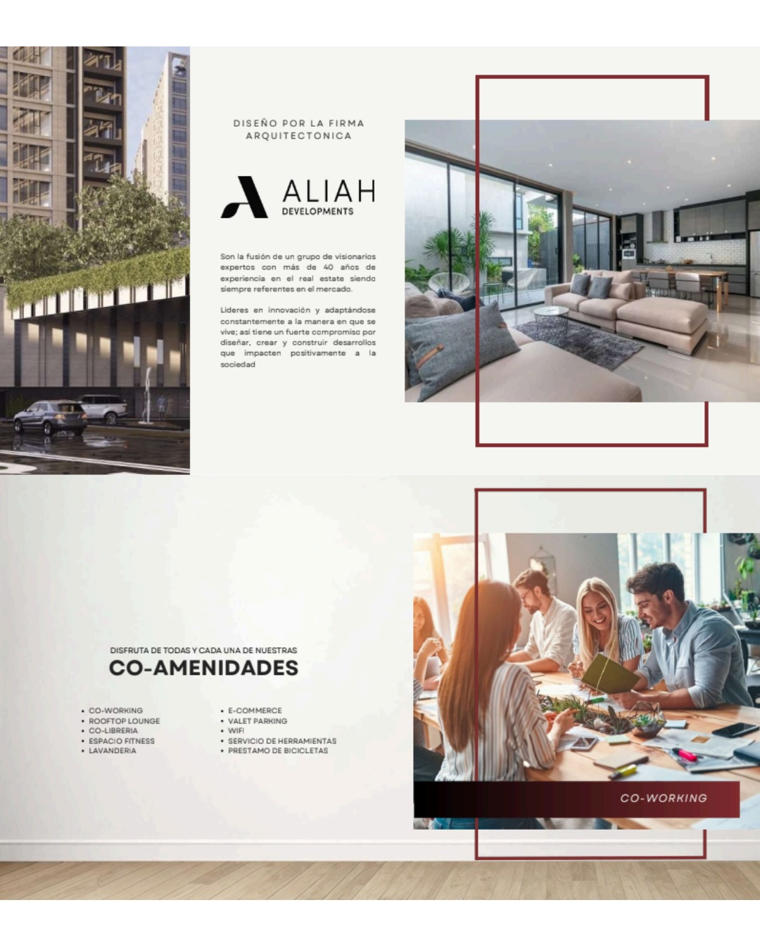 Roof Top Lounge con vistas privilegiadas, espacios para bicicletas, cuarto de herramientas, bodega para e-commerce, colibrería, lavandería, servicio de concierge, consolidación de servicios y valet parking. Además, cuenta con unidades tipo PH con balcón, brindando un diferencial adicional para usuarios e inversionistas.